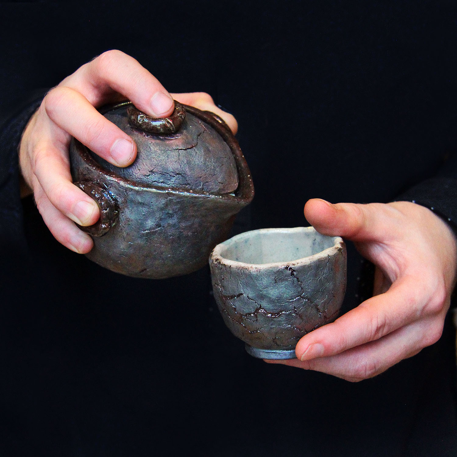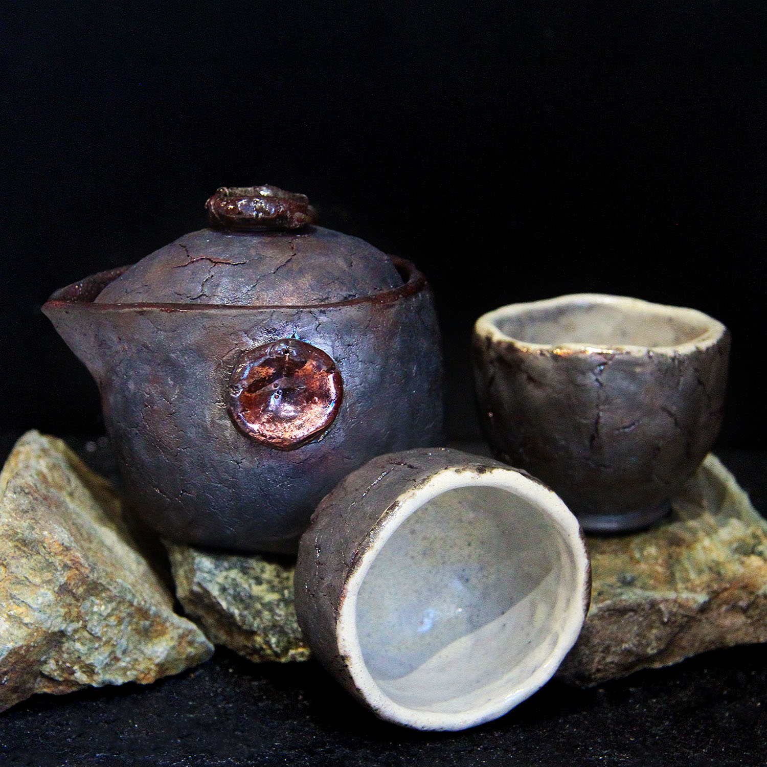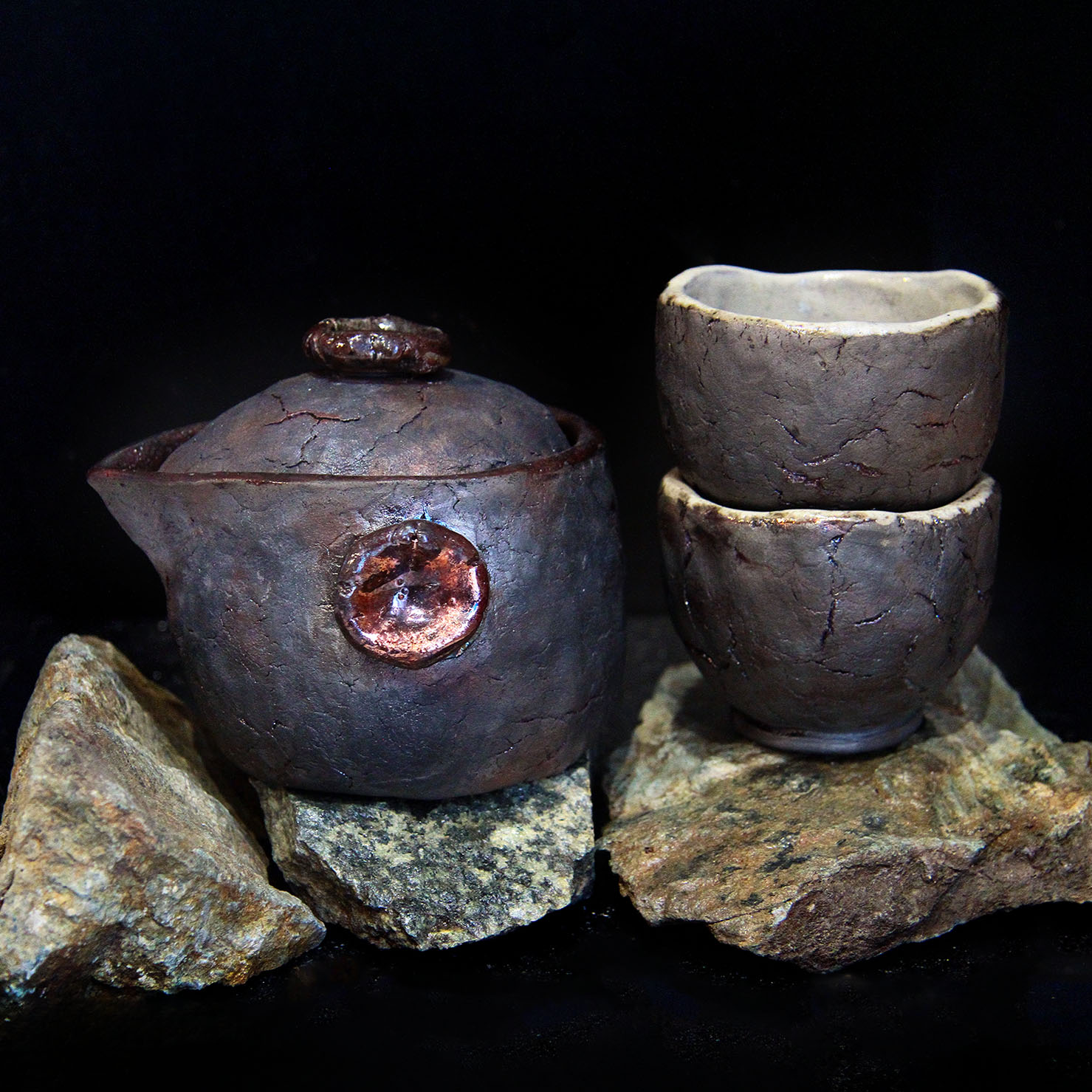 Чайный набор в технике раку — маленькая вселенная на двоих, где в трещинках глины мерцают медью остывшие звёзды. Он создан для неторопливых встреч, внимательных разговоров и тех вечеров, когда чай становится состоянием.