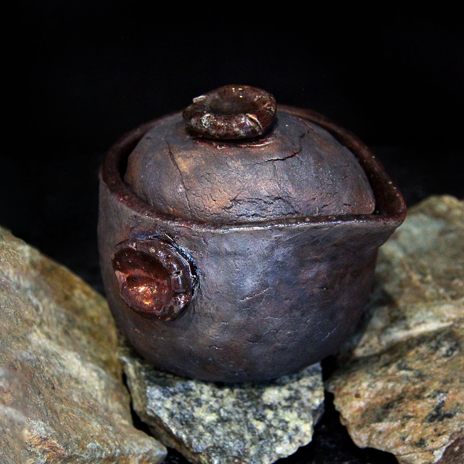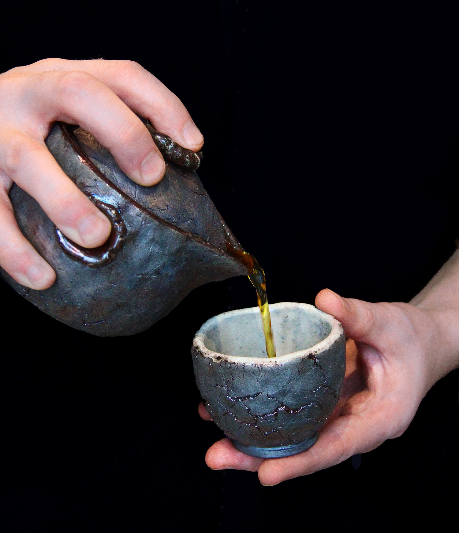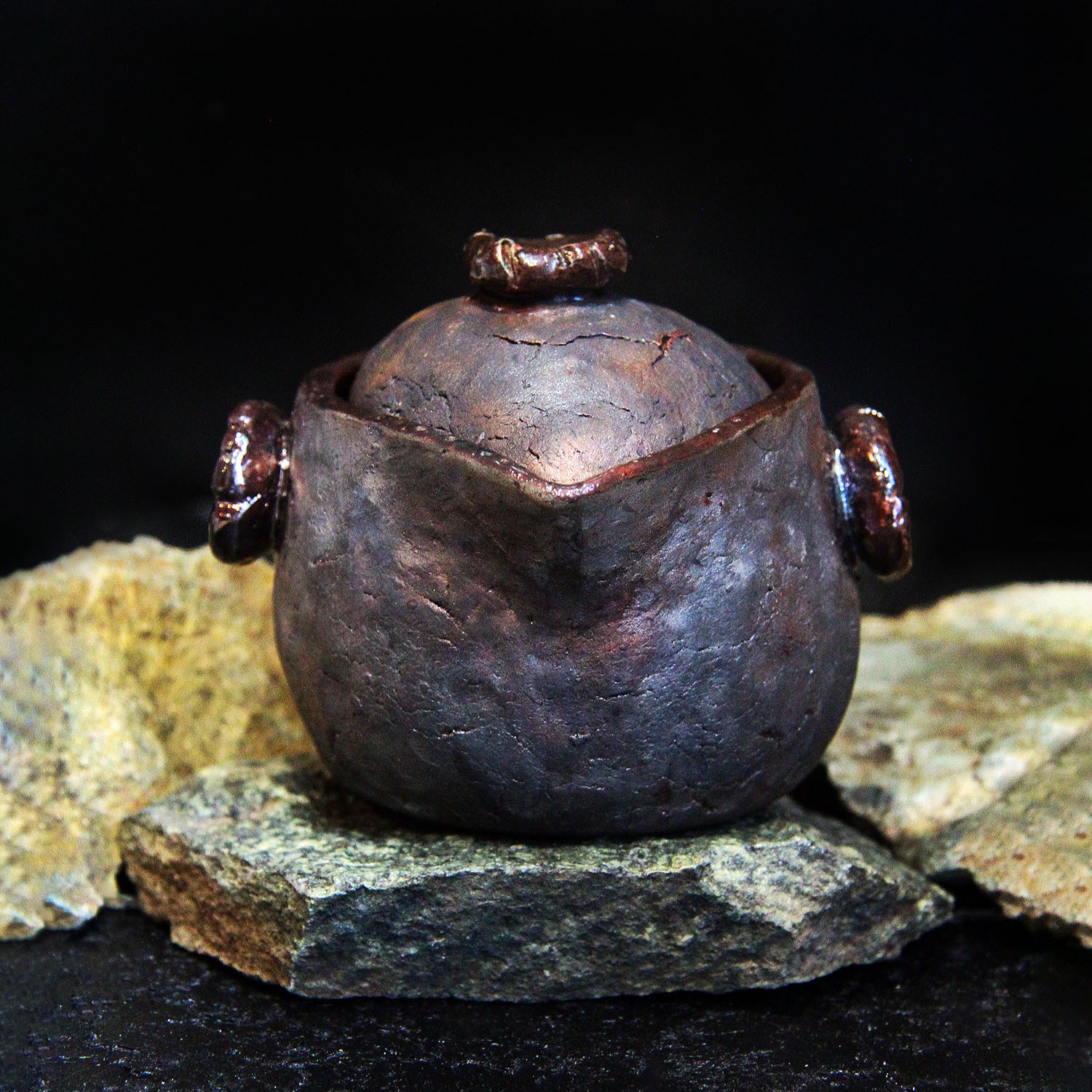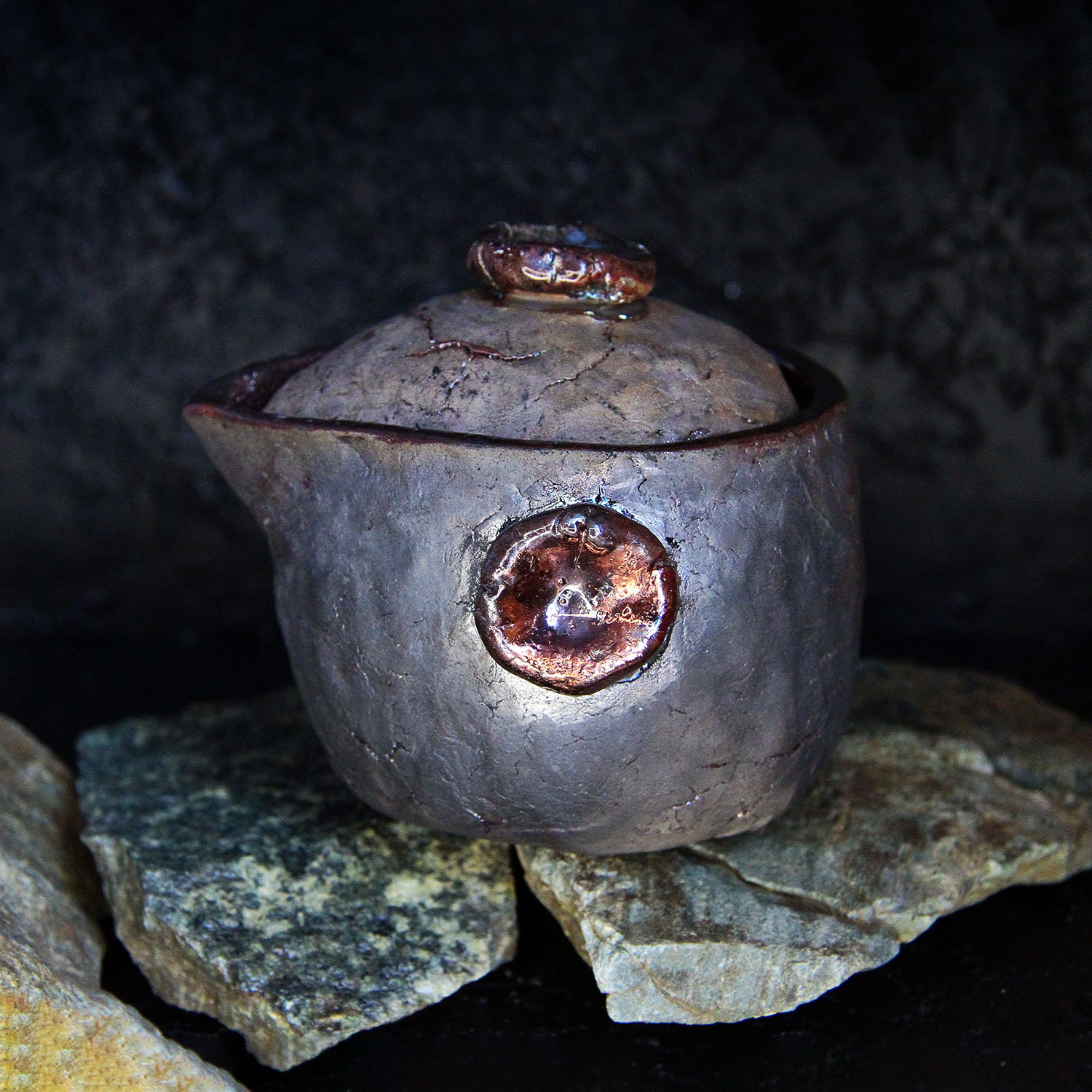 Чайный набор в технике раку — маленькая вселенная на двоих, где в трещинках глины мерцают медью остывшие звёзды. Он создан для неторопливых встреч, внимательных разговоров и тех вечеров, когда чай становится состоянием.